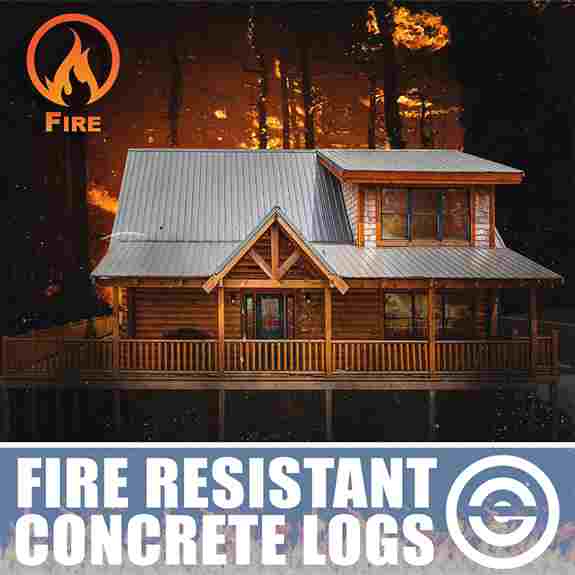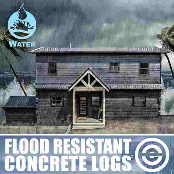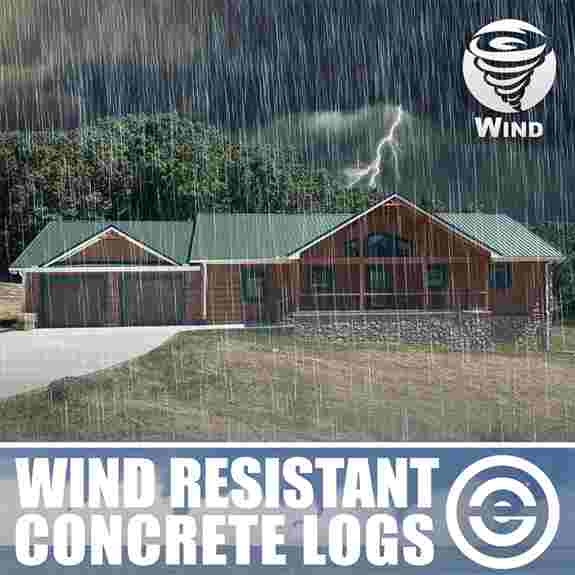 Structural concrete log wall system designed to resist wind loads of up to 240 mph. The beauty of wood with low maintenance appeal. Comes in a hand hewn or rough-sawn face, with corner system options. Concrete siding and trim boards also available.